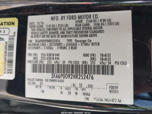 | VIN : 3FA6P0D92HR252476 |