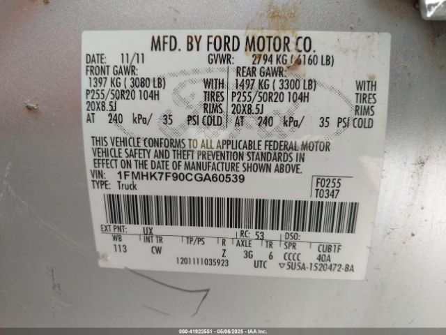 | VIN : 1FMHK7F90CGA60539 |