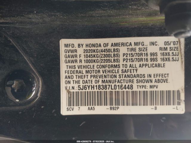 | VIN : 5J6YH18387L016448 |