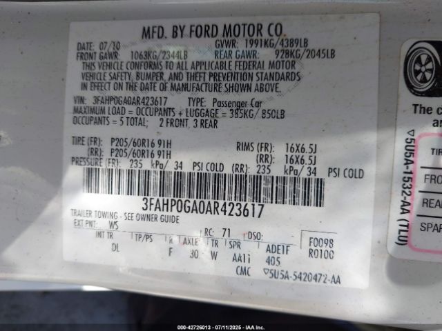 | VIN : 3FAHP0GA0AR423617 |