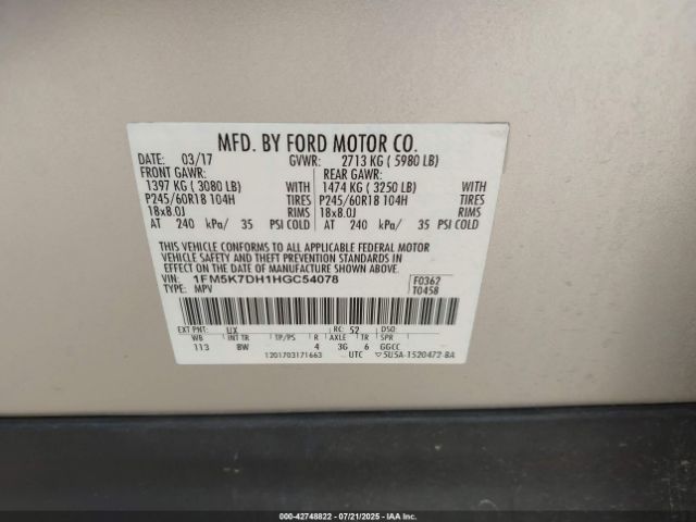 | VIN : 1FM5K7DH1HGC54078 |