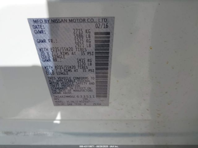 | VIN : 5N1AR2MM0GC633511 |