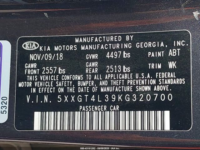 | VIN : 5XXGT4L39KG320700 |