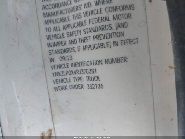 | VIN : 1NKZLP0X4RJ370281 |