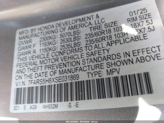 | VIN : 7FARS5H8XSE031869 |