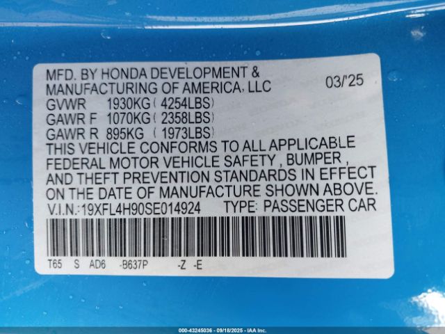 | VIN : 19XFL4H90SE014924 |