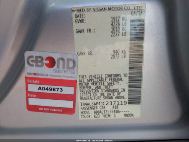 | VIN : 1N4AL3AP4JC237119 |