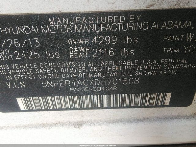 | VIN : 5NPEB4ACXDH701508 |