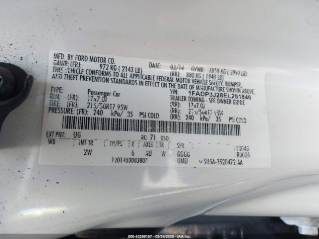 | VIN : 1FADP3J28EL281846 |