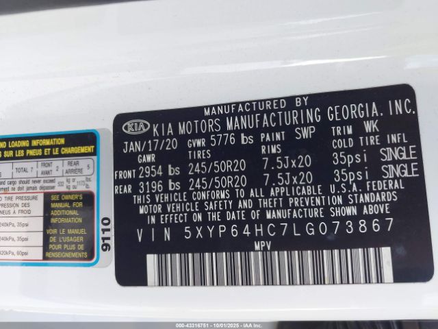 | VIN : 5XYP64HC7LG073867 |
