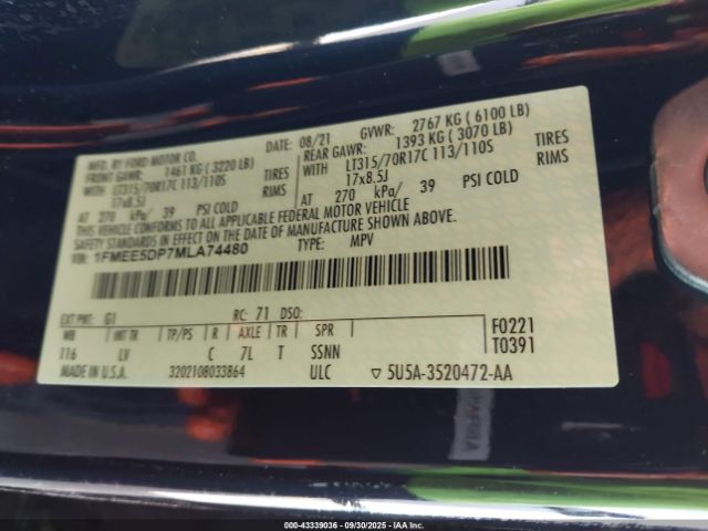 | VIN : 1FMEE5DP7MLA74480 |