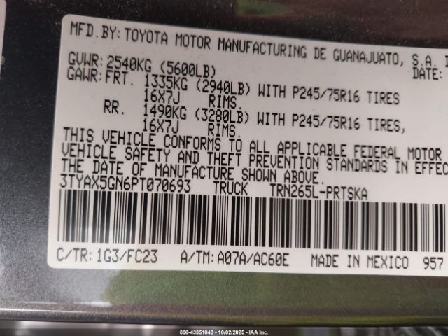 | VIN : 3TYAX5GN6PT070693 |