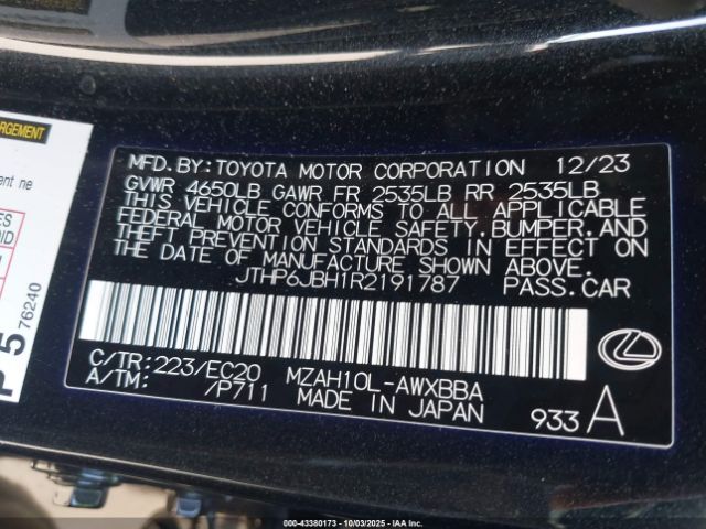 | VIN : JTHP6JBH1R2191787 |
