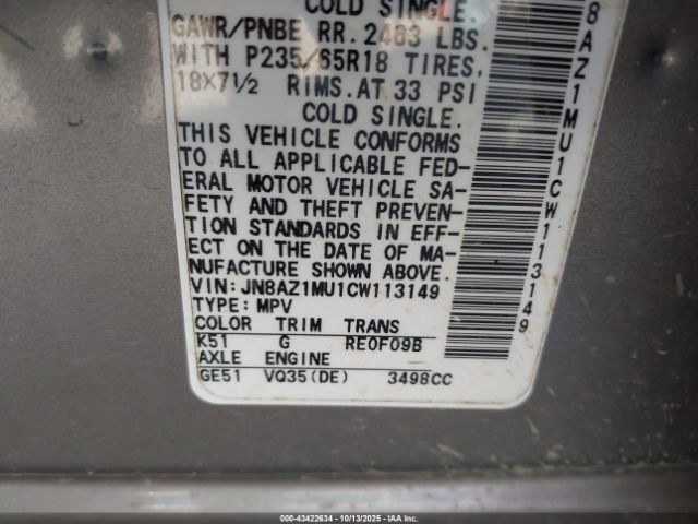 | VIN : JN8AZ1MU1CW113149 |