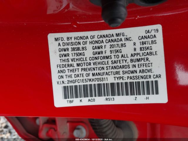 | VIN : 2HGFC1E57KH705311 |