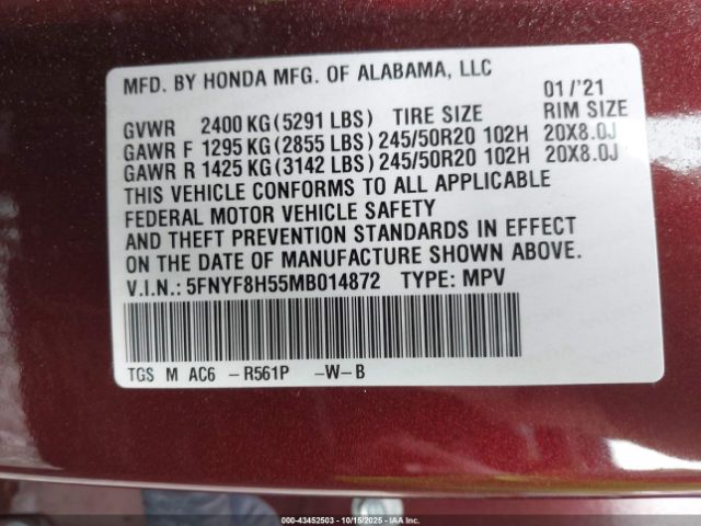 | VIN : 5FNYF8H55MB014872 |