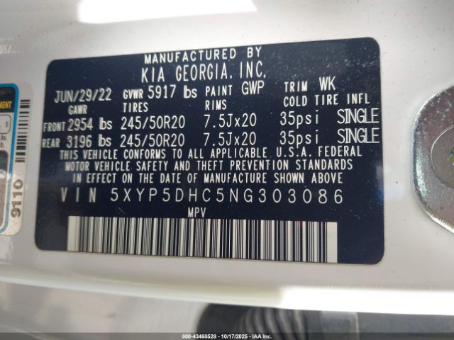 | VIN : 5XYP5DHC5NG303086 |