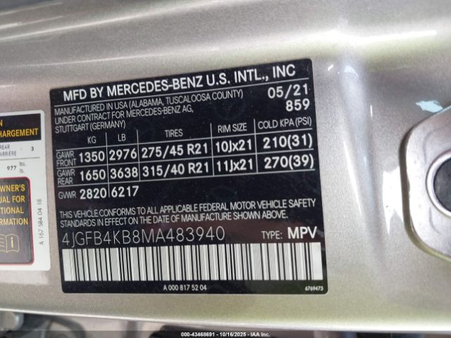 | VIN : 4JGFB4KB8MA483940 |