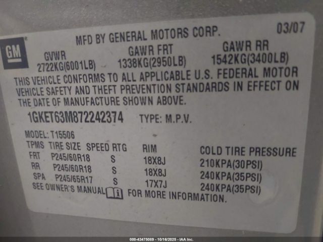 | VIN : 1GKET63M872242374 |