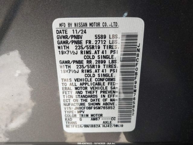 | VIN : JN8CF0BF9SM765852 |