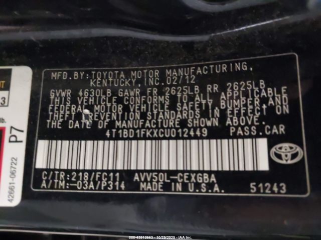 | VIN : 4T1BD1FKXCU012449 |