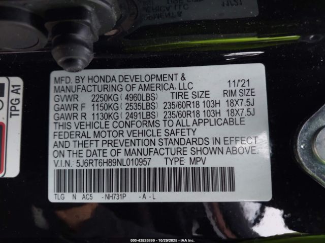 | VIN : 5J6RT6H89NL010957 |