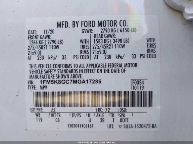 | VIN : 1FM5K8GC7MGA17286 |