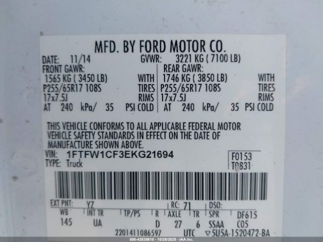 | VIN : 1FTFW1CF3EKG21694 |