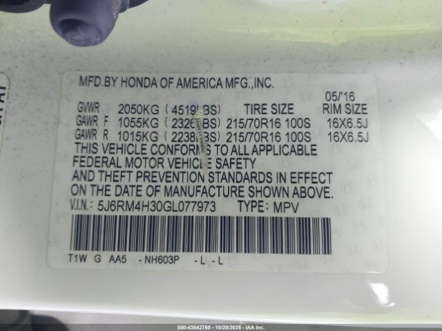 | VIN : 5J6RM4H30GL077973 |