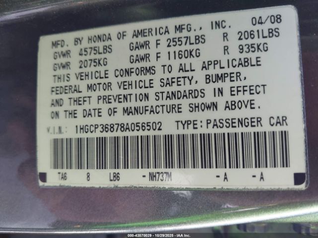 | VIN : 1HGCP36878A056502 |