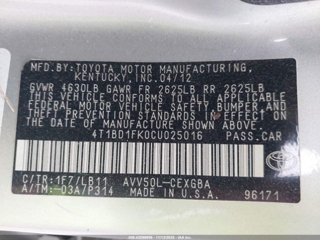 | VIN : 4T1BD1FK0CU025016 |