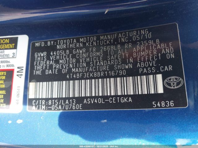 | VIN : 4T4BF3EK8BR116790 |