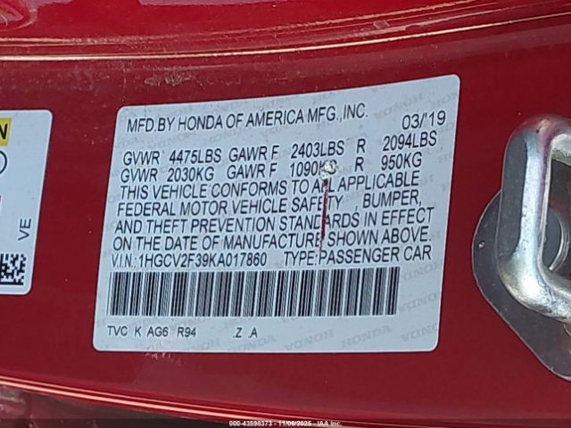 | VIN : 1HGCV2F39KA017860 |