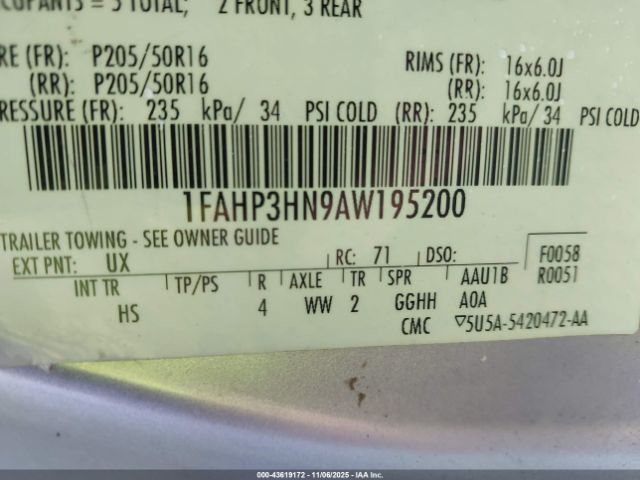 | VIN : 1FAHP3HN9AW195200 |