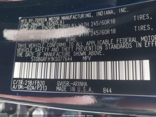 | VIN : 5TDBGRFH1KS077644 |