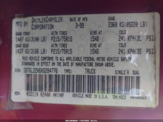 | VIN : 1B7GL22X6XS284776 |