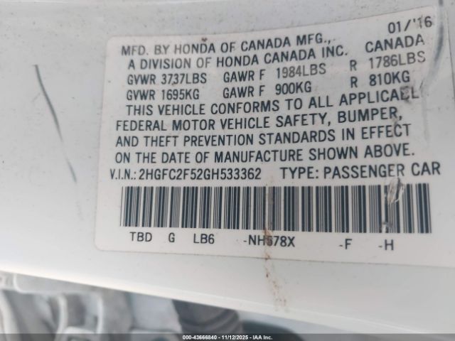 | VIN : 2HGFC2F52GH533362 |