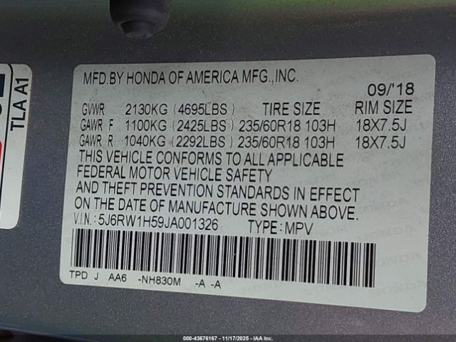 | VIN : 5J6RW1H59JA001326 |