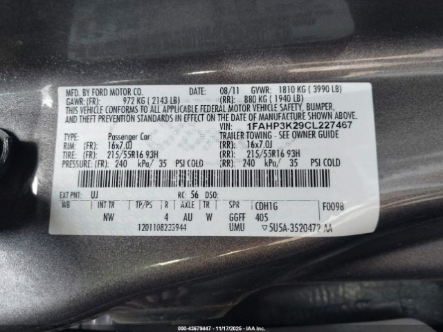 | VIN : 1FAHP3K29CL227467 |