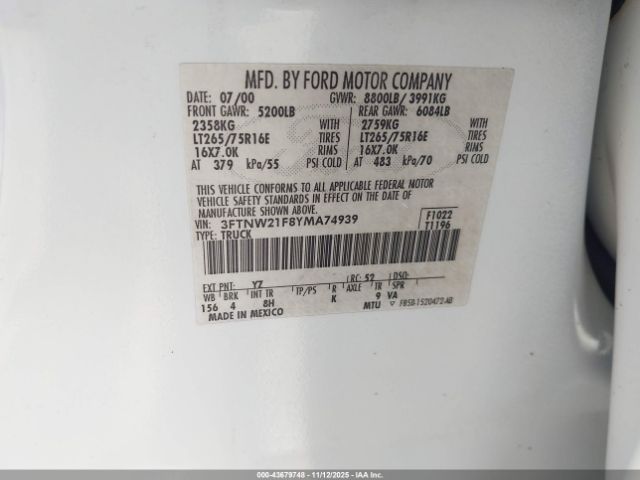 | VIN : 3FTNW21F8YMA74939 |