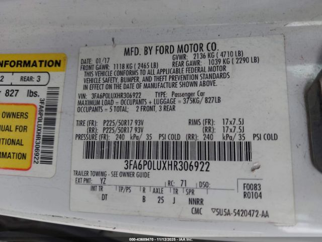 | VIN : 3FA6P0LUXHR306922 |