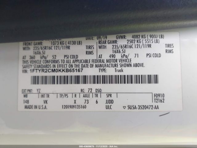 | VIN : 1FTYR2CM0KKB65167 |
