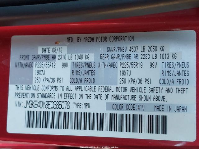 | VIN : JM3KE4DY8E0385078 |