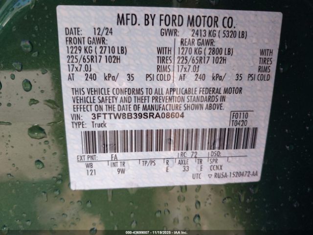 | VIN : 3FTTW8B39SRA08604 |