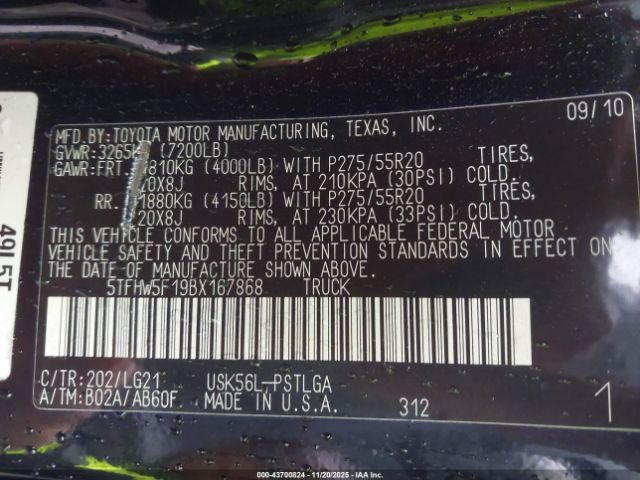 | VIN : 5TFHW5F19BX167868 |