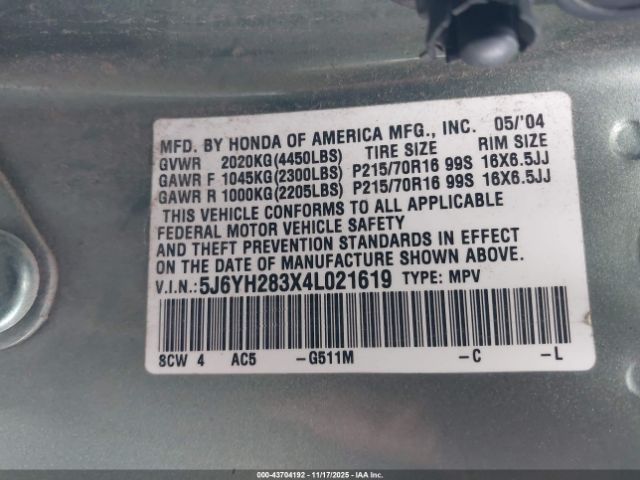 | VIN : 5J6YH283X4L021619 |