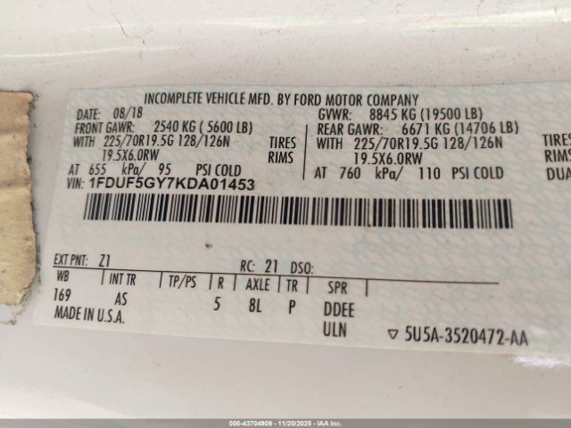 | VIN : 1FDUF5GY7KDA01453 |
