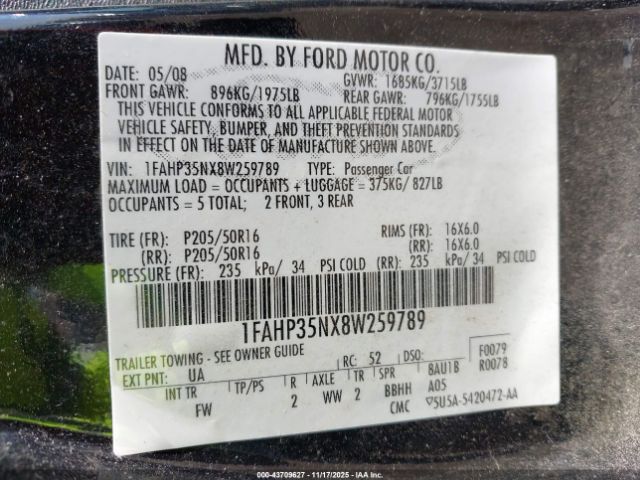 | VIN : 1FAHP35NX8W259789 |