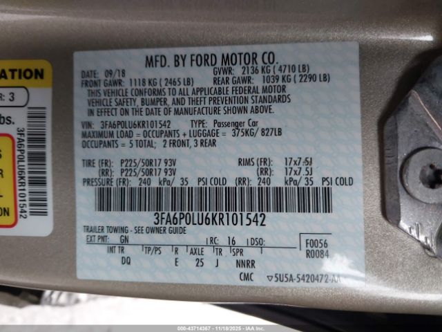 | VIN : 3FA6P0LU6KR101542 |