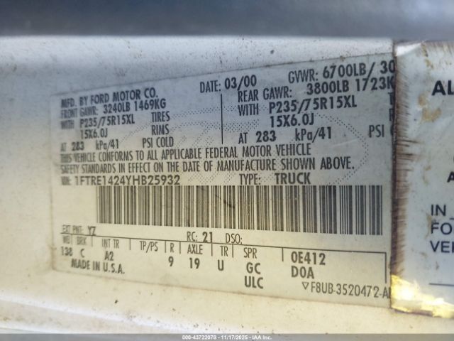 | VIN : 1FTRE1424YHB25932 |